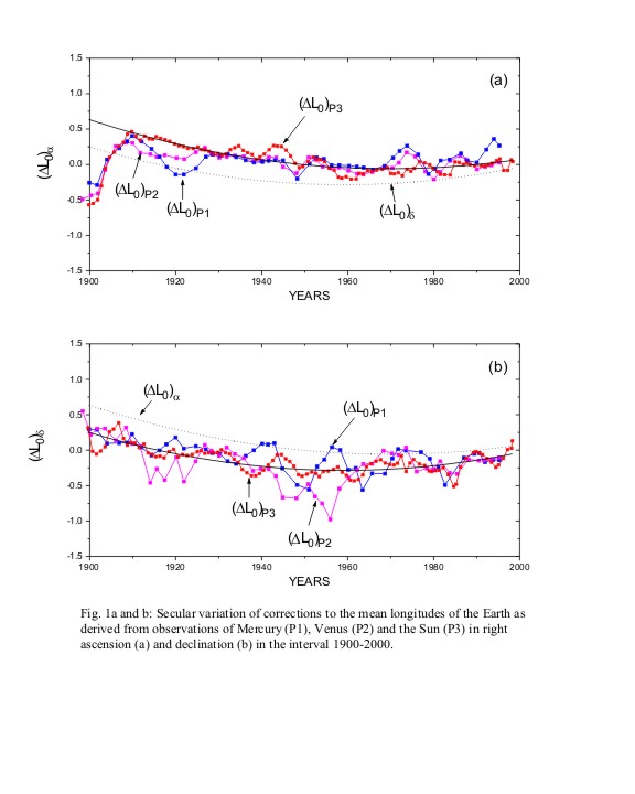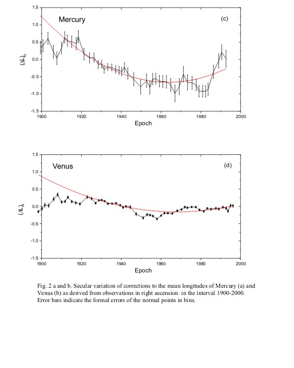 The last relation explains the angular acceleration of the planets in the solar system. Figures 1 and 2, which are from Kolesnik's paper (Kolesnik, 2000), show the observed angular accelerations of the inner planets. These measured accelerations agree with (5.9) if the Hubble time is about 14 billion years. For the Earth the EST acceleration is about 2.7 arcsec/century squared (2.7"/cy2) and the Earth approaches the Sun by about 25 meters/year.